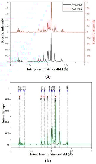 Exemplary diffractograms of TiCoCrFeMn alloy annealed during 100 h presented as a function of the interplanar distance dhkl (a) and the result of indicating the repetitive reflections (b).