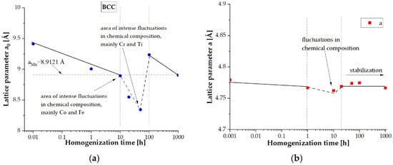 Due to the different radiation absorption of the alloy elements used and in order to accurately identify the obtained reflections, the diffractograms were related to the common parameter, namely the interplanar distance dhkl (Figure 11a). This allowed for the indication of plane reflections (Figure 11b) and the determination of the changes in the lattice parameters for the identified phases as a function of the annealing time (Figure 12). The parameters of the cubic lattice determined by the quenching method fluctuate around the manganese lattice parameter, differing by ±0.6 Å (Figure 12a). One can conclude that the resulting solid solution was formed on the basis of the manganese lattice. In the case of the hexagonal lattice, the values of the lattice parameters and the ratio of the identity periods c/a oscillating around the value 1.63 confirmed the formation of the multicomponent, intermetallic Laves C14 phase (Figure 12b,c). It should be highlighted that the changes in the lattice parameters correspond to the changes in the chemical composition. In both analyzed cases, it was observed that along with intense changes in the chemical composition observed after about 10 h of annealing, there is a nonmonotonic change in the lattice parameters of both identified phases. This allows us to distinguish the presence of three time intervals: an initial incubation period of up to 10 h of annealing, driven by the effect of slow diffusion, which is typical for high-entropy alloys; a period of significant fluctuations in both the chemical composition and lattice parameters; and finally, the stabilization of the content of individual alloy components and phase structure.