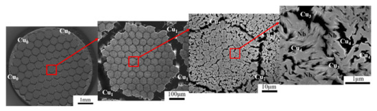 The cross-sectional SEM microstructure of the Cu-Nb composite wire containing 854 of Nb fibers is shown in Figure 1. The 854 Nb fibers were embedded in a Cu matrix with five different spacings of Cun: from the largest outer-most jacket (n = 0) to the finest nanoscale Cu (n = 4). Similarly, the 853 Nb fibers were embedded in a Cu matrix with four spacings of Cun (from Cu0 to Cu3). Similar results were also observed in the 852 and 85 samples. Based on the distance between Nb fibers, the scale of the copper matrix could be divided into three categories: micro-scale copper (M-Cu, larger than 1 μm), sub-micron-scale copper (S-Cu, 100 nm–1 μm), and nanoscale copper (N-Cu, less than 100 nm). The dimensional parameters and characteristics of the Cu-Nb composite wires at different ADB stages are displayed in Table 1. A linear intercept method was used to measure the dimension of the Cui and Nb fibers based on the SEM and TEM images (only dCu3, dCu4, and dNb in 854).