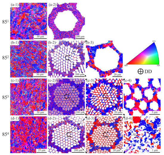 EBSD maps of copper matrix with different scales in different samples. (a-1) Cu0 in 851; (a-2) Cu1 in 851; (b-1) Cu0 in 852; (b-2) Cu1 in 852; (b-3) Cu2 in 852; (c-1) Cu0 in 853; (c-2) Cu1 in 853; (c-3) Cu2 in 853; (c-4) Cu3 in 853; (d-1) Cu0 in 854; (d-2) Cu1 in 854; (d-3) Cu2 in 854; (d-4) Cu3 and Cu4 in 854.