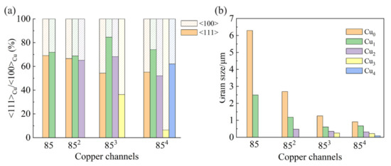 - Two fiber texture components, i.e., <111> and <100>, were found in the Cu matrix. In the micro-scale Cu matrix, the <111> texture weakened at higher levels of strain; for instance, the proportion of the <111> texture of Cu3 in 854 was less than 10%. In submicron and nanoscale Cu channels, a sharp <111> texture was observed due to the suppression of dynamic recrystallization at the interface. The grain size was affected by dynamic recrystallization and decreased as the degree of deformation increased. The grain size was reduced by the higher level of dynamic recrystallization at high strains.