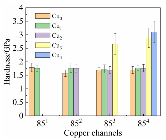 In addition, crystallographic orientation has a great effect on the hardness response in nanoindentation tests [27,28,29]. Wang et al. studied the mechanical properties of single-crystal Cu with different crystallographic orientations through nanoindentation, revealing that the nanohardness of (100)-, (110)-, and (111)-oriented single crystalline Cu are 1.33, 1.48, and 1.20 GPa, respectively [28]. Roa et al. studied the relationship between γ-(fcc) austenite grain orientation and nanoindentation hardness in metastable stainless steel, and found that (100) and (110) grains have lower hardness than (111) grains [27]. In the present study, the Cu4 channel in 854 had strong <111> fiber texture compared to other Cu channels, which could also have resulted in the abnormally high level of hardness.