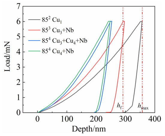 The depth ratio after unloading and at peak load (hf/hmax) is usually used to interpret the indentation behavior. Typical load/displacement curves of the examined samples are shown in Figure 6. The hf, hmax, and other parameters are derived from these curves. Pharr et al. [35,36] concluded that when the hf/hmax ratio is less than 0.8, the pile-up can be ignored. That is, the nanohardness value is reliable when hf/hmax < 0.8. Figure 7 displays AFM images and surface profiles at four typical indentation regions. Obviously, only in the nanocomposite regions (Cu3+Cu4+Nb/Cu4+Nb regions in 854) was the hf/hmax less than 0.8. Little pile-up was found in these regions (Figure 7f,h). In contrast, extended pile-up around the indent was observed in the regions with hf/hmax > 0.8 (Figure 7b,d).