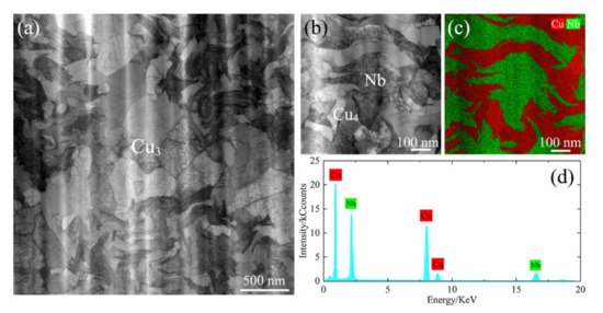 Transverse sectional HAADF-STEM of 854 Cu-Nb microcomposite wire, (a) Cu3+Cu4+Nb region, (b) Cu4+Nb region, (c) EDS elemental mapping, and (d) EDS spectrum of (b).