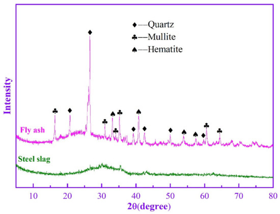 Class F fly ash (FA) used in this study was obtained from Baotian new building materials Co. Ltd. (Shanghai, China). Steel slag (SS) was supplied by Jinan steel group Co. Ltd. (Shanghai, China). As illustrated in Figure 1, the main phase compositions of FA were quartz, mullite and hematite, while SS has only an amorphous composition. The main oxide compositions of fly ash and steel slag were determined by X-ray fluorescence (XRF), and the results are shown in Table 1. The total content of SiO2 and Al2O3 of FA is 79.93%. The main oxide compositions of SS are SiO2 and Fe2O3. Figure 2 shows the morphology of the FA and SS. FA contains more regular spherical particles and few irregular particles. It can be seen that SS consists mainly of lumpy particles.