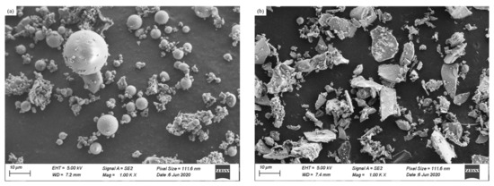 Particle morphologies as determined by secondary electron imaging in SEM: (a) FA and (b) SS.