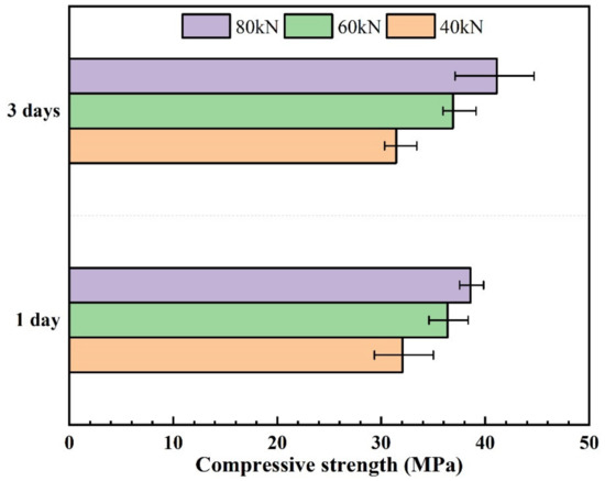 The effect of molding pressure on the compressive strength of selected FA60SS40 at different curing ages is shown in Figure 3. It is noteworthy that as the molding pressure increases, the compressive strength gradually increases. Compressive strength of precast geopolymers only increases by a small amount with curing age. If the molding pressure is above 80 kN in the experiment process, the alkali solution will leak out due to the higher pressure [25]. Therefore, the molding pressure of 80 kN was ultimately chosen.