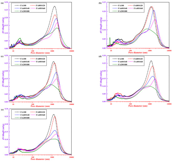 Figure 4 presents the measured pore size distributions of precast geopolymers at the age of 3 days and after different periods of water immersion. Figure 4a clearly shows that the peak value in the differential pore volume curve corresponds to the most probable pore diameter of precast geopolymers, and gradually shifts to a higher diameter as the content of steel slag increases at the age of 3 days. The most probable pore diameter of precast geopolymers at 3 days is 1335, 1392, 1815 and 1796 nm with the content of steel slag increased from 0 to 80 wt.%, respectively. Meanwhile, not only the peak value sharply decreases but also the total porosity of precast geopolymers decreases while the content of steel slag is above 20 wt.%. Therefore, the compressive strength of precast geopolymers increases slightly with the addition of the steel slag from 0 to 80 wt.% (Figure 4) while the most probable pore diameter increases progressively. The main reason is that spherical fly ash particles will increase the total porosity, while adding steel slag increases the compaction and decreases the total porosity of geopolymers [31,32,33]. After water immersion (Figure 4b–e), the peak value of precast geopolymers changes little when fly ash is replaced by 20 wt.% steel slag. However, the total porosity of precast geopolymers gradually increases, which results in a decrease in the compressive strength. Furthermore, the most probable pore diameter of precast geopolymers remarkably shifts to a fine diameter. It is noteworthy that the most probable pore diameter of FA100 at 3 days and after different periods of water-resistance is 1335, 1191, 1153, 1171, and 1251 nm, respectively. The water immersion could refine the pore sizes due to the geopolymerization process continuing progressively. However, some large pores are also present in this system; the pore sizes can be reduced by high-temperature treatments of geopolymers and hydrothermal transformation into dense ceramic phases.