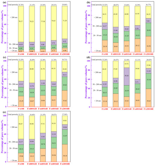 In addition, a careful examination of our study and the current literature indicates that the pore size could be divided into four principal zones according to Wu et al. [34]: harmless pores <20 nm, few harmful pores 20–50 nm, harmful pores 50–200 nm and more harmful pores >200 nm. Figure 5 displays the total porosity and pore size percentage of precast geopolymers at 3 days and at different periods of water immersion. The total porosity of precast geopolymers increases after 3 days of water immersion except for FA100. Increasing the period of water immersion, the total porosity of precast geopolymers will gradually decrease because water increases the contact points of reaction between raw materials and alkali metal ions.