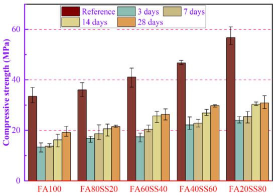 Compressive strength is a key physical quantity for evaluating the water resisting property of cement-based materials. The compressive strengths of precast geopolymers at the age of 3 days and after different periods of water immersion are shown in Figure 6. As can be seen from Figure 6, the compressive strength of precast geopolymers gradually increases with the increase of steel slag at 3 days. The compressive strength of FA20SS80 reaches the highest value (56.78 MPa). The rising in the compressive strength of precast geopolymers is the result of the total porosity and the percentage of harm pore of precast geopolymers decreasing little by little, which will be discussed in Section 3.2. However, the compressive strength of precast geopolymers after water immersion for 3 days decreases dramatically, which indicates that the internal deterioration of precast geopolymers is more severe than that of 3 days. The results indicate that precast geopolymers absorb a large amount of water through capillary pores because the lower ratio of water/binder causes the difference in humidity, which will release a large amount of OH−, Na+, Si4+ and Al3+ and break the bridges between the geopolymerization products and weaken the gel structure. As presented in Figure 6, the compressive strength of precast geopolymers gradually increases with increasing of the period of water immersion. This is because water increases the contact points of reaction between raw materials and alkali metal ions, which determines the polycondensation kinetics. The compressive strength of precast geopolymers after 28 days of water immersion is 19.2, 21.5, 26.31, 29.8 and 30.9 MPa with increasing content of steel slag from 0 to 80 wt.%, respectively. Meanwhile, it can be concluded that adding steel slag is beneficial to prevent the loss of compressive strength caused by water immersion. A study involving calcined kaolin indicated that nonevaporable water was necessary to keep the strength stable and the optimum content was about 7.4% [35].