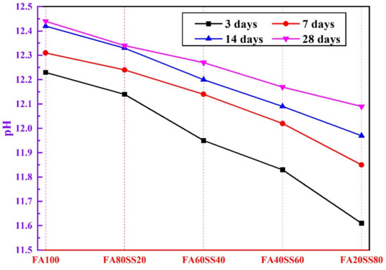 Figure 7 presents the pH values of the leaching solution. In general, the pH values of the leaching solution are higher while the specimens were immersed in water for 3 days. The total OH− content in the first 3 days has already reached above 80% of that of 28 days. The key reason is that a large amount of OH− is released on the surface and inside of specimens, which results in a higher pH in the first 3 days. With increasing of the period of water immersion, the pH values slowly increase [36]. The pH values of geopolymers from 3 days to 28 days after water immersion increase by 0.21, 0.20, 0.32, 0.34 and 0.48 respectively with increasing content of steel slag from 0 to 80 wt.%. However, the pH value of FA20SS80 after 28 days of water immersion is below that of FA100 after 3 days. Hence, all precast geopolymers made with steel slag exhibit a lower leachate pH after 3 days of water immersion, which means that adding steel slag not only increases the compact degrees of geopolymers, but also provides some benefits in decreasing the leaching rate of OH- due to the lower porosity.