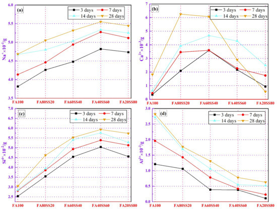 The ions content of Na+, Ca2+, Si4+ and Al3+ leached from the precast geopolymers at different periods of water immersion are presented in Figure 8. Figure 8a shows the evolution of Na+ content, where it can be observed that the content of Na+ gradually increases with an increasing period of water immersion [26]. At the same time, the content of Na+ increases firstly and then decreases with increasing steel slag dosage. The soluble Na+ content of geopolymers after 3 days of leaching accounts for more than 80 wt.% of that of 28 days. Furthermore, the dissolution of a large number of Na+ in the leachate will destroy the gel structure of geopolymers. The Ca2+ content of precast geopolymers is shown in Figure 8b. It can be observed that the soluble Ca2+ of precast geopolymers increases slightly during the water immersion process. The total Ca2+ content is below 6.5 × 10−3 g although steel slag contains a large amount of Ca2+. After a 28-day water immersion, the content of Ca2+ sharply decreases when the content of steel slag is above 40 wt.%. The reason is that increasing the content of steel slag will increase the most probable pore diameter of precast geopolymers, and the large amount of Ca2+ will react with soluble Si to form C-S-H in the surface of specimens. The Si4+ content of precast geopolymers observed in Figure 8c is progressively increased with increasing period, while it will increase firstly and then decrease with adding the steel slag. It is noteworthy that the total content of Si4+ increases as the content of steel slag increases. This indicates that steel slag contains amounts of soluble Si4+ comparing to fly ash. At the same time, the soluble Si4+ rate gradually decreases when the period of water immersion exceeds 14 days, which indicates that the soluble silicate has limited influence on the leaching of Ca2+ and Al3+. However, the Al3+ amount in the leaching solution is quite low, and gradually decreases with increasing steel slag content due to the low Al3+ content in steel slag and the dilution effect (Figure 8d). Increasing the leaching time, the total Al3+ content will gradually increase. The total content of Al3+ is below 3 × 10−3 g for all precast geopolymers, and the leaching content will increase gradually with increasing water immersion.