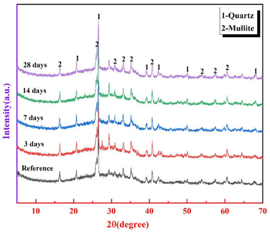 Figure 9 plots the XRD pattern of FA60SS40 at the age of 3 days and after different periods of water immersion. For all precast geopolymers, the crystalline phases are quartz and mullite, contributed by fly ash. However, there are amorphous N-A-S-H gels presented, as shown in the broad hump in the range of 20 to 40° 2 degree [37]. At the same time, there is no significant difference among the diffraction patterns of FA60SS40 after different periods of water immersion comparing to 3 days, indicating that the influence of water immersion on the phase compositions and crystallinity of geopolymers is negligible.