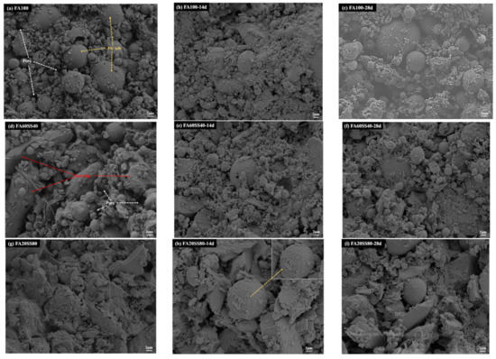 The morphology of precast geopolymers at the age of 3 days and after water immersion is shown in Figure 10. In Figure 10a, there are some pores and unreacted spherical fly ash particles on the surface of FA100 at the age of 3 days. Furthermore, the surface of particles is covered by N-A-S-H gels. Increasing the period of water immersion, the leaching of residual soluble silicon aluminum will not only put off polycondensation kinetics, but also lead to molecular destabilization of the precast geopolymer matrix. Specimens FA60SS40 and FA20SS80 show a more compact microstructure than that observed in FA100, as shown in Figure 10a,d,g. Considering the pore structure analysis and morphology of precast geopolymers, it can be found that adding the steel slag is beneficial to refine pore diameters and improves the compressive strength. Based on the observation of Figure 10d–f, the morphology of FA60SS40 changes a little at the age of 3 days and after water immersion. Moreover, steel slag and fly ash are uniformly piled up. It is also worth noting that the fly ash particles of FA20SS80 after 14 days water immersion are still covered by gel phases, as shown in Figure 10h. Thus, adding steel slag could improve the formation of (C, N)-A-SH-, prevent water attack and decrease the total porosity of precast geopolymers.