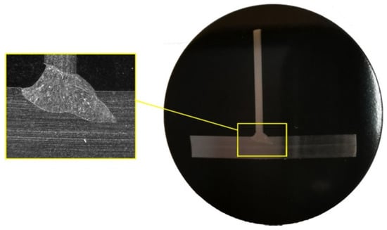 T-joint macrostructure in cross-section with shape marked before welding.