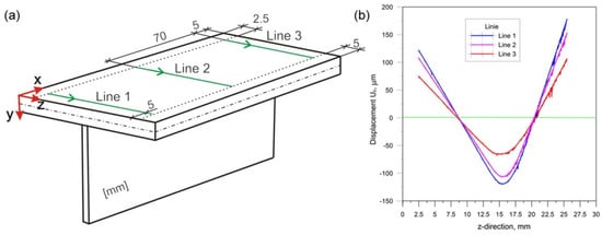 The measurements were carried out for three measurement lines in the perpendicular direction to the welding line. Figure 4a shows the measurement lines. The test results are presented in the diagram shown in Figure 4b.