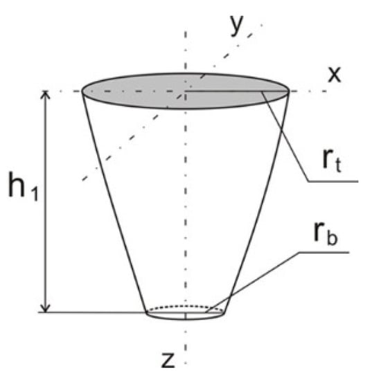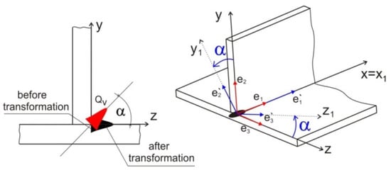 According to experimental research, the numerical model described by Equation (3) assumes a linear decrease of source energy with the depth of penetration of the material by the laser beam. The volume of laser source in the form of a truncated cone is assumed (Figure 5). Performing a fillet weld between the connected flat bars required inclination of the welding source. Therefore, numerical modelling of fillet welded also requires the inclination angle of the laser beam heat source distribution axis. It is necessary to transform the vertical axis of the beam source by the angle α adopted in the experiment. The transformation of the coordinate system is performed in DFLUX subroutine. The schema of heat source coordinate transformation is shown in Figure 6.