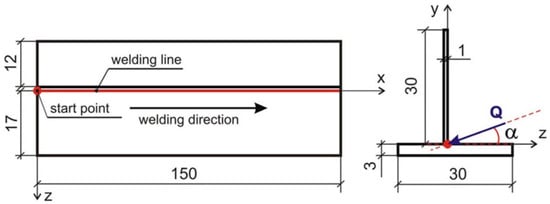 Numerical calculations for all case inclination of heat source are performed in Abaqus/Standard solver, extended with additional, self-made numerical subroutines. The discrete model is developed on the basis of the geometry used in experimental research. Varying with temperature material properties of X5CrNi18-10 austenitic steel are used in the material module of Abaqus. The modified Gauss model presented in Section 3 is included into the DFLUX subroutine. Laser beam power, welding speed, the inclination of laser beam are assumed on the basis of experimental research. 3D numerical model of analyzed case is developed for computer simulations of the process. The scheme of the analyzed domain is shown in Figure 7.