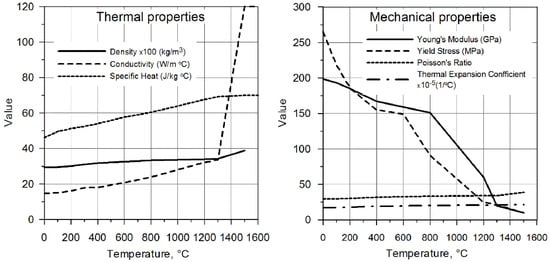 The Abaqus materials module takes into account changes of physical properties of welded element in the function of temperature and heat convection coefficient k = 100 W/m2. The thermomechanical properties of the welded T-joint presented in Figure 8 are assumed in numerical simulations for austenitic steel X5CrNi18-10 []. Chemical composition: 0.06 C, 17–19 Cr, 11–13 Ni, N < 0.11 [%].