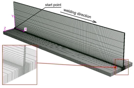 The densest finite element mesh is concentrated in the place of the greatest temperature gradients. The mesh changes linearly, increasing the size of the element with the distance from the weld line. About 370,000 finite elements are used in the developed model. The created finite element mesh allows us to minimize the duration of the numerical simulation while maintaining good quality simulation results. A simplification by applying the perfect contact between two joined surfaces is assumed in computer simulations. The analysis of thermomechanical phenomena is carried out using the “uncoupled” method. First, calculation of temperature field is carried out, followed by numerical analysis of mechanical phenomena. The results from the thermal analysis are the input data for the mechanical analysis. The mechanical boundary conditions were adopted in accordance with the boundary conditions contained in publication [].