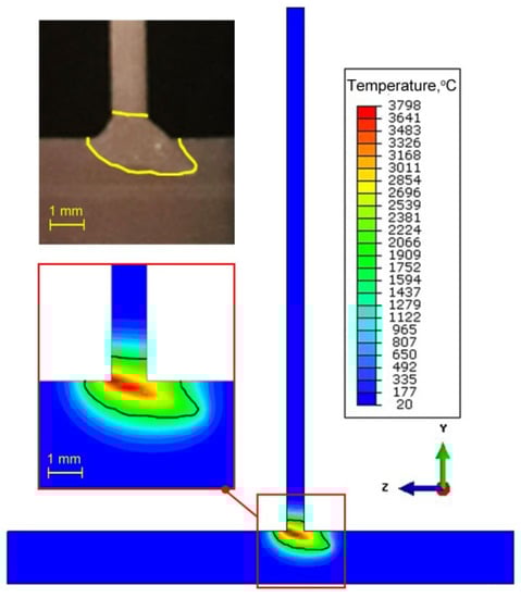 The temperature field and the shape of the FZ are numerically estimated. Figure 10 shows the temperature distribution in the general view for two different process duration times t = 3 s and t = 5 s. For the result presented in Figure 11, the beam inclination angle was α = 20°. For the same slope, Figure 11 shows the temperature field in ZY plane of the welded T-joint. In order to compare the results of numerical prediction with experimental tests, the boundary of melted zone (TL ≈ 1455 °C) is marked with a solid line. The numerically estimated shape of the weld is marked on the macroscopic picture of the joint. The comparison of FZ geometry with macroscopic view shows that a good representation of the weld shape is obtained. Good compliance of the calculation results with the experiment is obtained for the following source parameters: source penetration depth d = 2.8 mm, beam radius rt = 0.2 mm (for z = 0), beam radius rb = 0.08 mm (for z = h1), h1 = 4 mm.