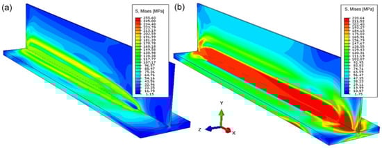 On the basis of the simulations carried out in the Abaqus FEA program (ver.6.10) of mechanical phenomena, the stress state and the displacement field of the welded T-joint were determined. Figure 12a present temporary reduced stresses, while Figure 12b presents residual stresses.
