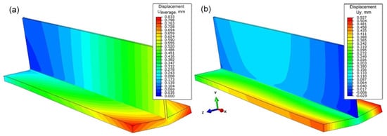 The maximum value of these stresses is less than 220 MPa. The maximum concentration of stresses occurs in the welding line. The displacement area is numerically estimated for welded T-joint. Figure 13 shows the displacement field in the general view. Figure 13a shows averaged displacements, while Figure 13b shows vertical displacements (in accordance with the Y-axis). The largest displacements of 0.5 mm occur at the ends of edges of T-joint legs in final parts of welded joint.