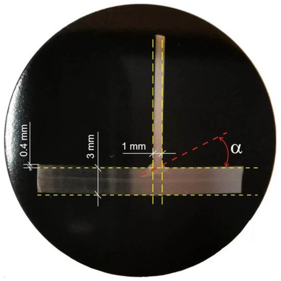 Figure 14 shows a macroscopic picture of welded joint, which marked thicknesses of joined flat bars, the axis of the weld is inclined at an angle α = 20° and dashed lines that indicate the shape of the system before welding. The comparison of plotted lines with the cross-sectional view of welded joint shows that both ends of the legs of T-joint and the vertical element of T-joint are displaced.
