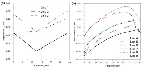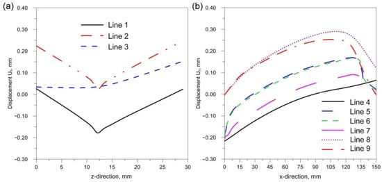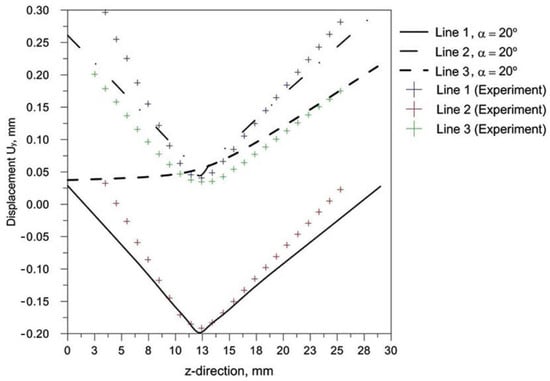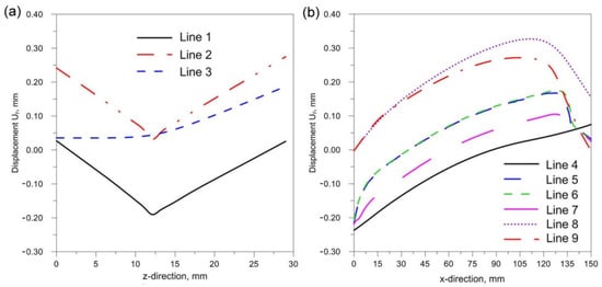 The comparison of presented figures of reduced stresses, shows that the change in the inclination of the source has no significant effect on the change in the value of stresses in the joint. The difference between the values is approximately 5 MPa. Figure 21, Figure 22 and Figure 23 show the diagrams of displacement Uy for the source inclinations α = 20°, 30° and 40°, respectively. Figure 21a, Figure 22a and Figure 23a show the results for lines (lines 1, 2, 3) perpendicular to the weld line of the joint. Whereas Figure 21b, Figure 22b and Figure 23b describe the results for lines parallel to the welding lines (measuring lines 4–9).