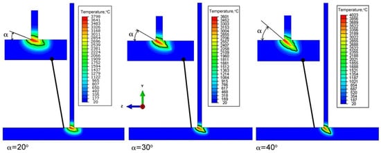 Analyzing the results of the simulation of thermal phenomena presented in Figure 16, it can be concluded that the change in the beam inclination has a significant impact on the shape of the weld pool. Increasing the angle of inclination of the beam results increased penetration of the lower part T-joint which is most visible with the slope α = 40°. Changing the angle of inclination also reduces the melted zone on the opposite side of the vertical element of T-joint. Further increasing the angle of inclination may prevent full penetration. This contributes to the decrease of the quality of the welded joint.