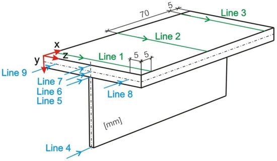 The results of stress state and forecasting of the displacement of a welded T-joint are presented in the following figures. The results presented in these figures are determined for nine measurement lines, in accordance with the diagram shown in Figure 17.