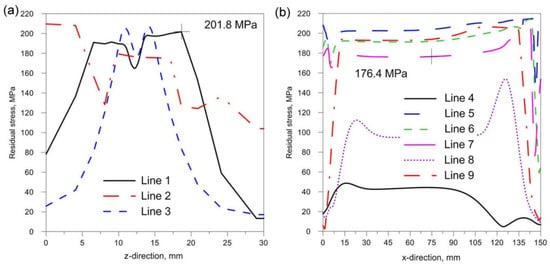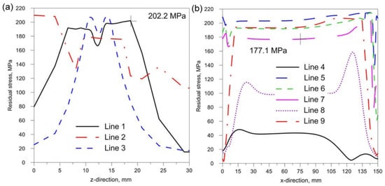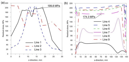 Figure 18, Figure 19 and Figure 20 show the diagrams of residual stresses for the source inclinations α = 20°, 30° and 40°, respectively. Figure 18a, Figure 19a and Figure 20a show the results for lines (lines 1, 2, 3) perpendicular to the weld line of the joint, whereas Figure 18b, Figure 19b and Figure 20b describe the results for lines parallel to the welding lines (lines of the measurement 4–9).