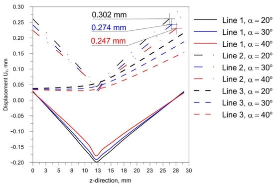From the comparison of the simulation results shown in Figure 24, it can be noticed that the change of the beam inclination reduces the value of Uy displacements. For the analyzed model difference between slope α = 20° and 30° is about 0.03 mm.