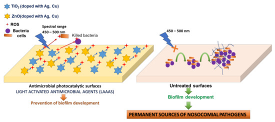 The COVID-19 pandemic has demonstrated the vulnerabilities of modern society and showed how little is known about medical ethics and public infection control strategies [1,2]. One of the greatest challenges of the health systems, therefore, remains the problem of healthcare-associated/acquired infections (HAI) that cause, every year, 4.5 million infections in Europe, leading to significant mortality and financial losses for health systems [3]. The first two main problems that directly influence the incidence of HAIs are multidrug-resistant (MDR) bacteria spread and persistence [4,5] and the long-time colonization of the medical surfaces with highly pathogenic strains that generate mono or multispecies biofilms [6,7,8]. Pathogens such as vancomycin-resistant enterococci (VRE), methicillin-resistant Staphylococcus aureus (MRSA), multiresistant Gram-negative bacilli (Acinetobacter boumanii, Pseudomonas aeruginosa, Klebsiella sp.), norovirus, and Clostridium difficile persist in the health care environment for days and increase the risk of acquisition for other patients [9]. The most important specialists in the field have drawn attention to the fact that we are heading towards a global “post-antibiotic” era and a future pandemic crisis [10].