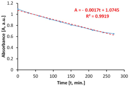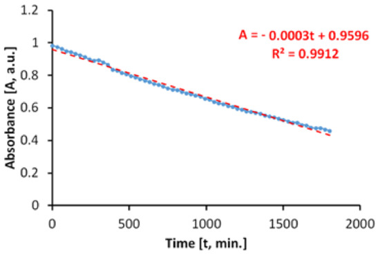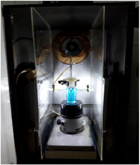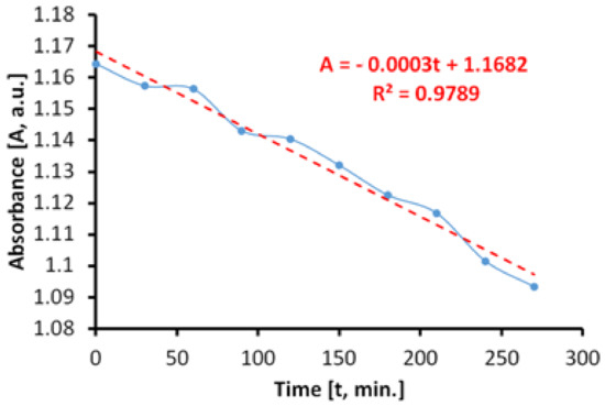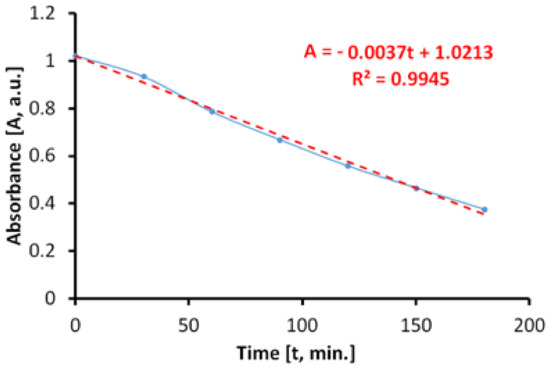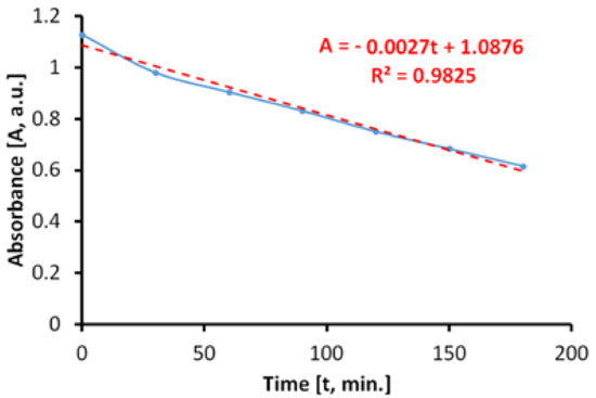 The absorbance of the methylene blue solution was measured at a wavelength λ = (664 ± 2) nm. The absorbance was determined by external measurements of the test solution and then the return of the measured solutions to the test solution. The absorbance was measured at 30 min intervals, at most until the solution discolored. The molar absorption coefficient of the MB solution considered was ε = 7402.8 m2/mol. A UV/Vis spectrometer (Jasco UV-Vis-NIR V-570) was used to determine the MB concentration, calibrated in the measuring range 400 nm ≤ λ ≤ 800 nm.