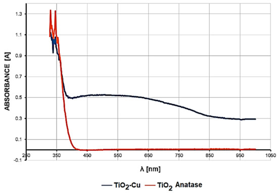 Figure 4 shows the UV-Vis optical absorption spectra in the 330–1000 nm wavelength range for copper-doped TiO2 anatase pigment compared to that of non-doped TiO2 anatase pigment sample. A strong absorption can be observed in the range 330–370 nm, relatively equal for both samples. For the copper-doped TiO2 anatase pigment (2%), a strong increase in light absorption in the wavelength range between 400 and 700 nm, with a wide maximum between 420 and 620 nm, has been observed.