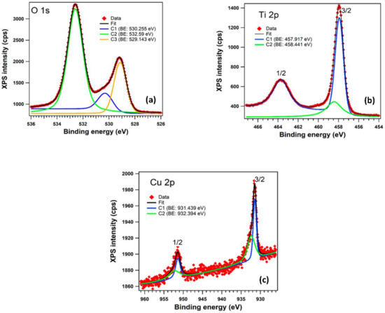 X-ray diffraction has been used to determine the composition of the powder. The XRD pattern shows sharp diffraction peaks which indicate the crystallinity of the system (Figure 6). Copper dopant was observed in cubic phase (PDF Card No. 01-080-5762) and titanium dioxide was found to be in the form of tetragonal anatase phase (PDF Card No. 00-064-0863).