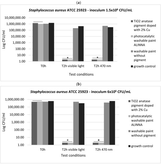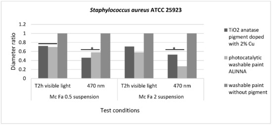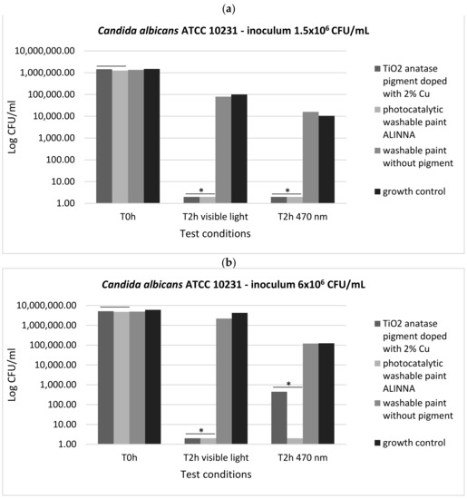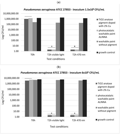 In the present study, the antimicrobial qualitative results demonstrate the photocatalytic activation of copper-doped TiO2 pigment and photocatalytic paint ALINNA in both conditions (blue light and visible light 470 nm), the ROS molecules generated by the products causing inhibitory effects against all tested microbial strains (S. aureus ATCC 25922, P. aeruginosa ATCC 27853, and C. albicans ATCC 10231), even when the microbial cell density was higher. In order to confirm the photoactivation reaction of the copper-doped TiO2 pigment and ROS molecules release, and to quantify the antimicrobial activity, the viable cell count method (VCC method) was performed, using two test conditions (visible light and blue light—470 nm) and two cell suspensions with different final densities (1.5 × 106 CFU/mL and 6 × 106 CFU/mL). The products confirmed the qualitative results, showing microbicidal activity after 2 h of exposure of tested strains in both concentrations, with significant decrease of CFU/mL values compared with control growth controls and paint control product. These results, together with the physicochemical characterization of tested products, entitle us to support with certainty the photocatalytic activation of copper-doped TiO2 product, and also, its efficiency as a new method of photocatalytic protection of medical supplies surfaces.