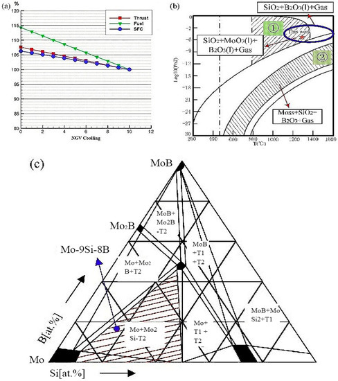 (a) Effect of high-conductivity cooling air volume on engine performance in our calculation: Thrust is getting higher with the decrease of the cooling air volume. (b) Calculated oxygen partial pressure diagram for the Mo-9Si-8B-O system Adapted from [10]. (c) Isothermal section of Mo-Si-B at 1600 °C, the composition chosen for this study was marked Adapted from [11].