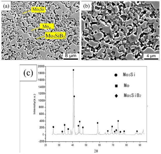 Figure 2a showed the surface microstructure of the sintered alloy, and the high magnification was revealed in Figure 2b. The continuous Moss (light phase, Mo solid solution), Mo5SiB2 (dark phase), and Mo3Si (gray phase) were confirmed by the XRD result, and the distribution of these phases was inferred by EDS scanning. The intermetallic phase can be seen clearly and dispersed in the Moss base phase. The area ratio was used to replace the volume fraction, and the average volume fraction of Moss phase was 54.9 vol.% calculated 10 times by Image-Pro Plus software (6.0). To some extent, the volume fraction of the Moss phase was close to the expected target of 50 vol.%, which committed to maintaining relatively balanced mechanical properties and antioxidant properties [12,13,14]. The density increase of oscillatory sintering can be measured by the Archimedes suspension wire method. Compared with traditional hot-pressing sintering, this density was increased by 9.25 g/cm3, and its relative density reached 97.78%.