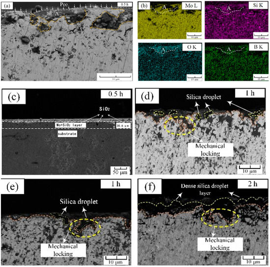 As shown in Figure 3a,c, after 30 min of pre-oxidation, a discontinuous oxide layer was formed on the outermost surface of the alloy (Figure 3a,c). Under the outermost oxide layer, an intermediate layer of 30.6 μm existed on the substrate (Figure 3c). After investigation and analysis by EDS, the black granular part was SiO2 oxide, and the rest was almost the Moss phase. The region ‘A’ is the region that firstly underwent an oxidation reaction to form a large amount of silica, which can be confirmed by the EDS scanning results marked ‘A’ in Figure 3b. The formation of silicon dioxide consumed the intermetallic phase, causing the unoxidized part of the outermost layer to belong to the Moss phase, which was consistent with Mendiratta’s results [15]. Another point worth noting was that in the first oxidized area ‘A’, the reduction of the distribution of boron can be clearly found, which indicated that the boron oxide volatilized rapidly at this temperature, leading to the loss of B element. Figure 3d,e showed the morphology of the surface oxide layer after 1 h. It could be seen that a ≈1–2 μm thin containing-SiO2 layer had been formed. The most important point was that in the contact part between the outermost oxide and the intermediate layer, there were black silicon dioxide particles grown from the substrate to link the oxide layer with the intermediate layer, which acted as a mechanical locking [16]. It closely connected the SiO2 oxide layer with the substrate, which reinforced the protection. After 2 h of pre-oxidation as observed in Figure 3f, the depth of mechanical locking was further deepened, and a dense silica protective layer was formed on the surface of the substrate, which adhered well to the substrate.