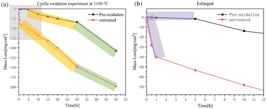 As shown in Figure 6a, the oxidation mass loss curve at 1150 °C was plotted. The pre-oxidized sample had a mass loss of −107.5 mg/cm2 after 50 h of exposure to the air, which was −198.3 mg/cm2 compared to the sample without pre-oxidation treatment. Although the weightlessness has been reduced by nearly 91 mg/cm2, the weightlessness of 50 h had not been substantially improved. However, it can be seen from the partially enlarged view of Figure 6b that the pre-oxidation layer played a very good protective role in the initial period and delayed the progress of the oxidation behavior.