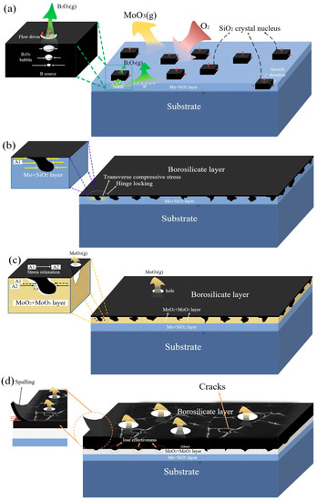 As shown in Figure 7b, the B-poor borosilicate layer formed by pre-oxidation has a mechanical locking effect and plays a role of articulation. According to the calculated PRB values of 2.1 > 1 and 1.01 > 1, the SiO2 formed by the first selective oxidation will expand along with the lateral growth and the longitudinal growth. Since the longitudinal volume expansion hardly generates stress, the inwardly extending SiO2 particles undergo lateral expansion to generate compressive stress. The pre-oxidized intermediate layer is the Mo-based layer, and the thermal expansion coefficient is 10 times larger than the SiO2 melt. The lateral volume expansion causes stronger compressive stress, forming a locking mechanism, increasing the adhesion to the substrate.
