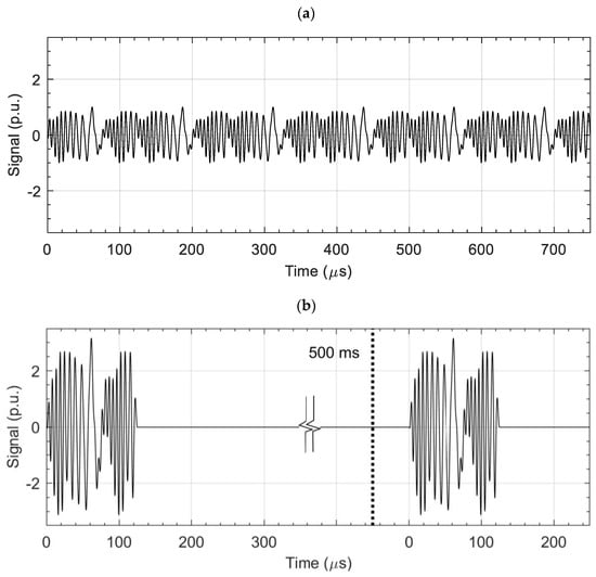 A complex excitation signal containing many sinusoids creates an opportunity to detect all kinds of defects. The frequency range has been selected so that it is possible to detect surface and deeply located defects in tested specimens. Their selection also considered the maximum RMS value of the current flowing in the coil (to avoid overheating). More specifically, the number of frequencies was N = 15 and the frequencies were in the range . The signal amplitude at the beginning and end of a pulse rises and falls linearly to shorten the transition state.