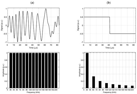 Comparison of the frequency spectrum for PMFES/MFES-ECT (a) and PECT (b). The signal is at the top and its spectrum (FFT) at the bottom. Signal parameters were selected to obtain the equal amplitude of the first harmonic for both signals.