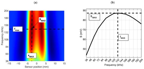Spectrogram: the two-dimensional plot (a) and frequency characteristic for XMAX point (b) with marked parameters (SMAX, fMAX) corresponding to the material defect.