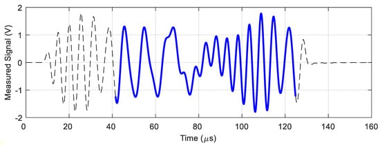 The measured signal on the pickup coil. The blue line marks the signal segment that is subject to further analysis.