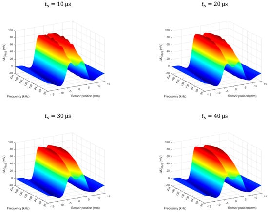 A series of simulations with a different location of the flaw in relation to the sensor was performed—at a distance of −15 mm to 0 mm (the defect was directly under the middle column of the sensor) with a step of 0.5 mm. In order to compare the MFES-ECT and PMFES-ECT methods, a series of simulations, “frequency sweep” and “time simulation”, were performed for each flaw position.