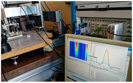 The essential components of the PMFES-ECT measurement system are an excitation signal generator (NI PXI 5422 manufactured by NI based in Austin, TX, USA, sample rate 200 MS/s, 80 MHz bandwidth, 16-Bit waveform generator), a power amplifier (HSA 4101, manufactured by NF Corporation based in Yokohama, Japan, frequency range DC to 10 MHz, slew rate 5000 V/μs, max., current 1.4 A, amplification gain 1–20) used as the excitation coils driver, an eddy current transducer, an A/D capture device (NI PXI 5922 manufactured by NI, Austin, TX, USA, A/D converter maximum sampling rate 15 MS/s, maximum resolution 24 bits) and a PC with dedicated software. A photo of the experimental setup is presented in Figure 7.