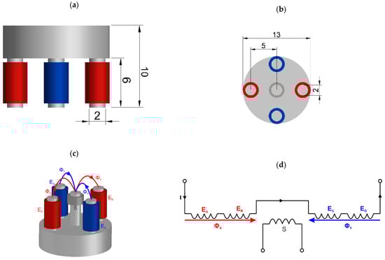 Views of the five columns of ECT transducer used in the experiments: (a) front view with dimensions, (b) bottom view with dimensions, (c) view with magnetic fluxes, the two groups of the excitation coils are marked with red and blue color, (d) the simplified electrical scheme of the probe.